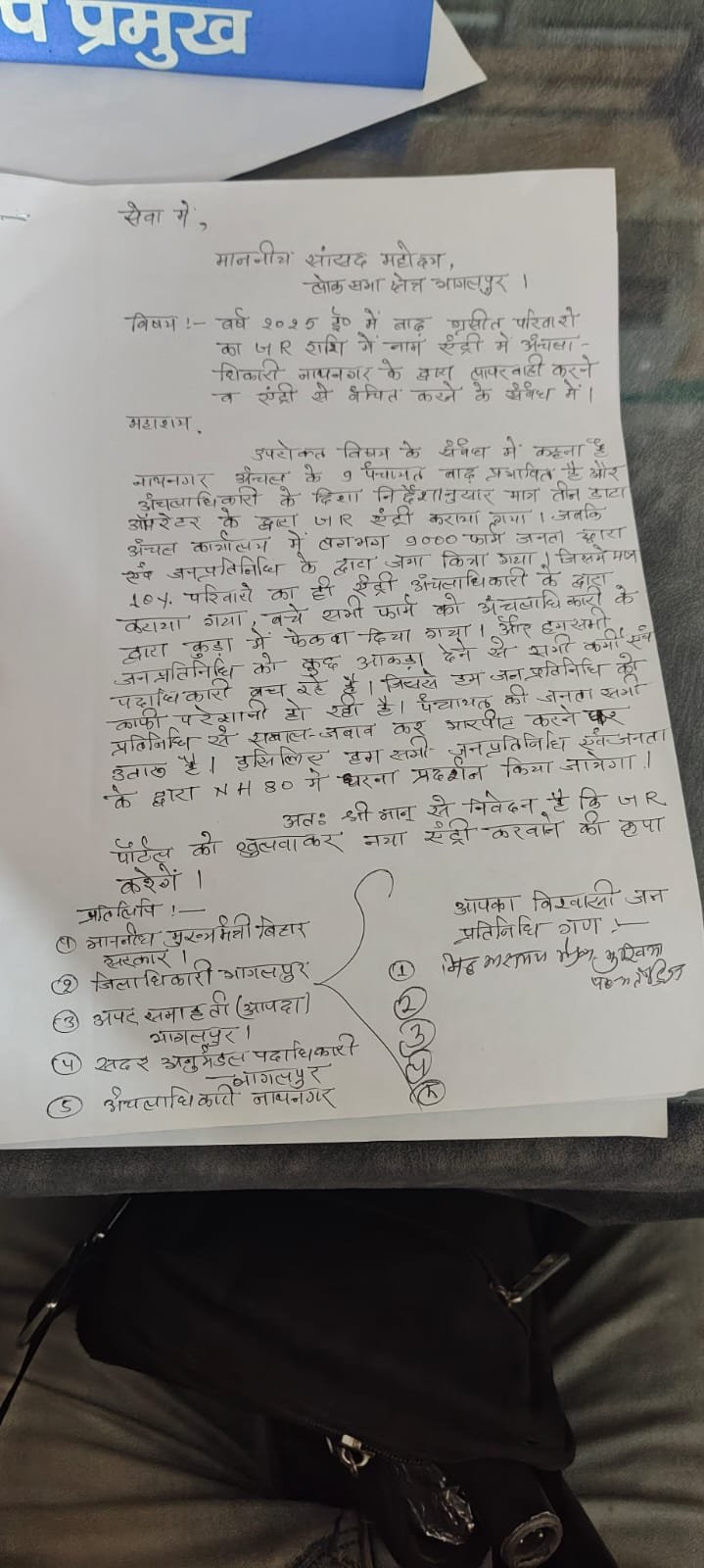 शुभम कुमार/भागलपुर:वर्ष 2018 की भीषण बाढ़ से प्रभावितों परिवारों को राहत पहुँचाने में नाथनगर अंचल प्रशासन की लापरवाही एक बार फिर सामने आई है। जनप्रतिनिधियों का आरोप है कि बाढ़ से पीड़ित परिवारों का नाम एंट्री से जानबूझकर वंचित किया गया, जिससे हजारों परिवार सरकारी सहायता से वंचित रह गए। जनप्रतिनिधियों द्वारा दी गई जानकारी के अनुसार, नाथनगर अंचल के एक पंचायत क्षेत्र को बाढ़ प्रभावित घोषित किया गया था, और अंचलाधिकारी के निर्देशानुसार मात्र तीन डाटा ऑपरेटरों से राहत फॉर्म की एंट्री कराई गई। इस प्रक्रिया में केवल 800-1000 फार्मों की एंट्री संभव हो सकी, जबकि अंचल कार्यालय में लगभग 10,000 फार्म जनता एवं जनप्रतिनिधियों द्वारा जमा किए गए थे। चौंकाने वाली बात यह है कि अंचल कार्यालय ने लगभग 90% फार्मों की एंट्री नहीं कराई और आरोप है कि शेष फार्मों को जानबूझकर नष्ट कर दिया गया। जनप्रतिनिधियों ने दावा किया है कि अंचलाधिकारी ने सैकड़ों फार्मों को “कूड़े में फेंकवा” दिया और जब उनसे आंकड़े देने की माँग की गई, तो सभी कर्मचारी एवं पदाधिकारी टाल-मटोल करने लगे। इस गंभीर लापरवाही से जनप्रतिनिधियों की साख पर भी प्रश्नचिह्न लग गया है, क्योंकि जनता अब उनसे जवाब माँग रही है। पीड़ित परिवार लगातार अपने जनप्रतिनिधियों से सहायता की गुहार लगा रहे हैं, जिससे प्रतिनिधियों को भारी दबाव का सामना करना पड़ रहा है। स्थिति से नाराज़ होकर, जनप्रतिनिधियों ने अब आवाज़ बुलंद करने का फैसला लिया है। उनका कहना है कि यदि प्रशासन ने जल्द इस विषय पर संज्ञान नहीं लिया और दोषियों पर कार्रवाई नहीं की, तो NH-80 पर धरना प्रदर्शन किया जाएगा। इसमें न केवल जनप्रतिनिधि, बल्कि सैकड़ों पीड़ित परिवार भी भाग लेंगे। धरना-प्रदर्शन की योजना को लेकर क्षेत्र में हलचल तेज हो गई है। अब देखना यह है कि प्रशासन इस गंभीर आरोप पर क्या कदम उठाता है और क्या पीड़ित परिवारों को उनका हक मिल पाएगा या नहीं।